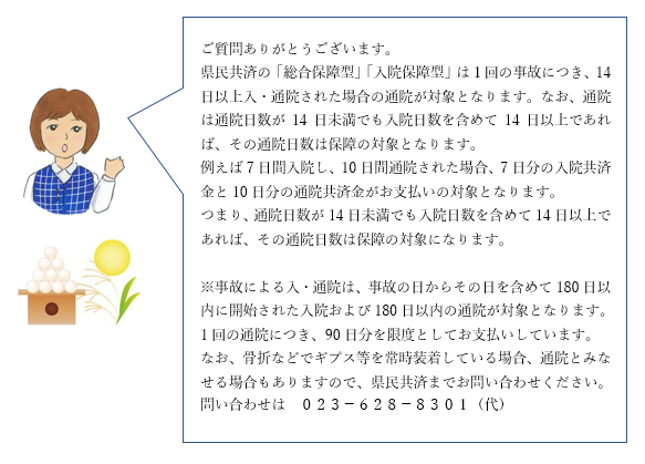 県民共済の「総合保障型」「入院保障型」は1回の事故につき、14日以上入・通院された場合の通院が対象となります。なお、通院は通院日数が14日未満でも入院日数を含めて14日以上であれば、その通院日数は保障の対象となります。