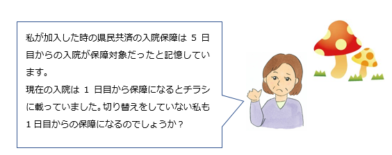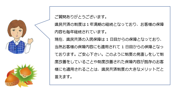 現在、県民共済の入院保障は1日目からの保障となっており、当然お客様の保障内容にも適用されて1日目からの保障となっております。ご安心下さい。このように制度の見直しをして制度改善をしていることや制度改善された保障内容が既存のお客様にも適用されることは、県民共済制度の大きなメリットだと言えます。