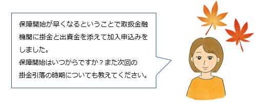 Q.保障開始が早くなるということで取扱金融金に掛金と出資金を添えて加入申込みをしました。保障開始はいつからですか?また次回の掛金引落の時期についても教えてください。