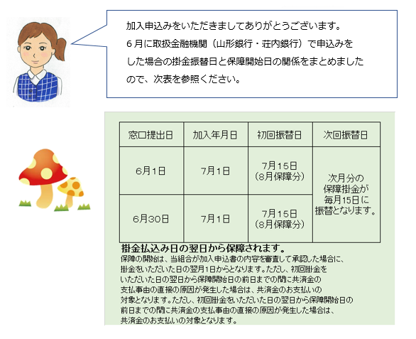 A.加入申込みいただきましてありがとうございます。6月に取扱金融機関(山形銀行・荘内銀行)で申込みをした場合の掛金振替日と保障開始日の関係をまとめましたので下表を参照ください。