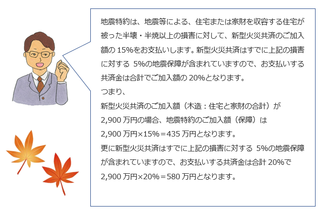 地震特約は、地震等による住宅または家財を収容する住宅が被った半壊・半焼以上の損害に対して、新型火災共済のご加入額の15%をお支払いします。新型火災共済はすでに上記の損害に対する5%の地震保障が含まれていますので、お支払いする共済金は合計で新型火災共済のご加入額の20%となります。