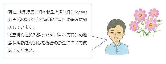 Q.現在、山形県民共済の新型火災共済に2,900万円(木造:住宅と家財の合計)の保障に加入しています。地震特約で加入額の15%(435万円)の地震保障額を付加した場合の掛金について教えてください。