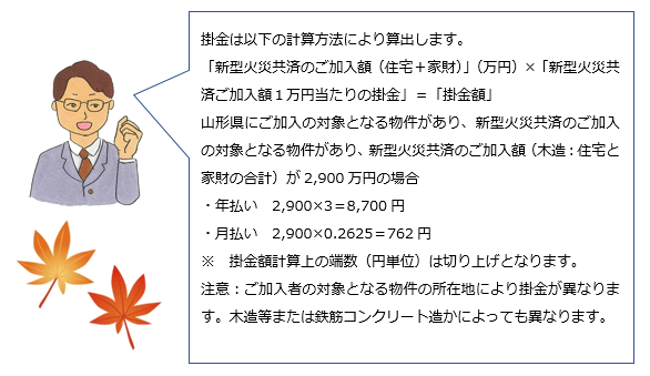 A.掛金は以下の計算方法により算出します。「新型火災共済のご加入額(住宅+家財)」(万円)×「新型火災共済ご加入額1万円当たりの掛金」=「掛金額」山形県にご加入の対象となる物件があり、新型火災共済のご加入の対象となる物件があり、新型火災共済のご加入額(木造:住宅と家財の合計)が2,900万円の場合・年払い 2,900×3=8,700円・月払い 2,900×0.2625=762円※ 掛金額計算上の端数(円単位)は切り上げとなります。注意:ご加入者の対象となる物件の所在地により掛金が異なります。木造等または鉄筋コンクリート造かによっても異なります。くわしくはPCはこちらをご覧くださいスマホはこちらをご覧ください