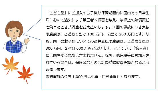 「こども型」にご加入のお子様が保障期間内に国内での日常生活において過失により第三者へ損害を与え、法律上の賠償責任を負ったとき共済金をお支払いします。1回の事故につき支払限度額は。こども1型で100万円、2型で200万円です。なお、同一のお子様についての通算支払限度額は、こども1型は300万円、2型は600万円となります。ここでいう「第三者」には同居する親族は含まれません。なお、他保険等にも加入されている場合は、保険金などの合計額が賠償責任額となるよう調整します。※賠償額のうち1,000円は免責(自己負担)となります。