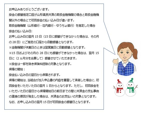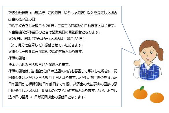 お申込みありがとうございます。掛金の振替指定口座が山形県民共済の取扱金融機関の場合と取扱金融機関以外の場合とで初回掛金の払い込み日が違います。