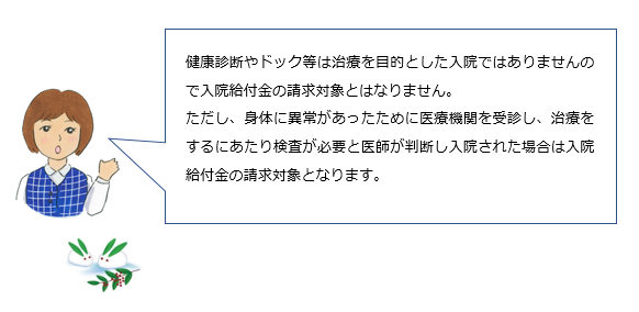 健康診断やドック等は治療を目的とした入院ではありませんので入院給付金の請求対象とはなりません。ただし、身体に異常があったために医療機関を受診し、治療をするにあたり検査が必要と医師が判断し入院された場合は入院給付金の請求対象となります。