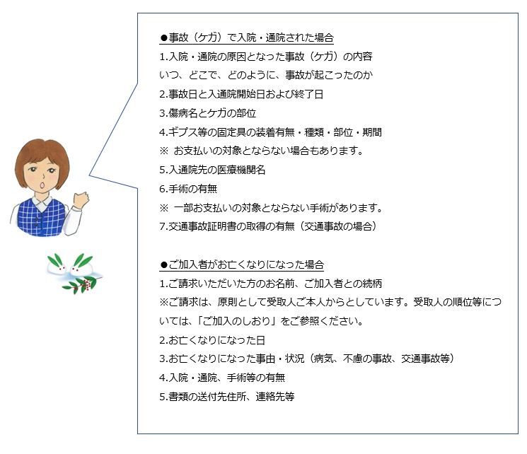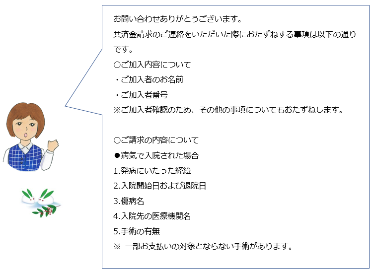 共済金請求のご連絡をいただいた際におたずねする事項は以下の通りです。
