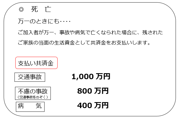 現在、県民共済の「総合保障2型」+「医療1型特約」に加入している40歳の者です。私が万一、事故や病気で亡くなった場合に遺された家族に支払われる死亡共済金について教えてください。