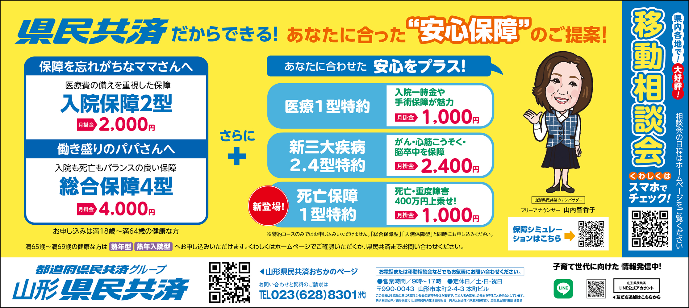 新聞 令和7年1月8日・15日・20日の山形新聞の紙面に『山形県民共済だから出来る!負担の少ない掛金プランと特約コースも付けた充実保障!』と銘打ち、「たとえば子育て世代のご家族の保障プラン」を紹介しています。ぜひご確認ください。また、県内各地で大好評をいただいている移動相談会の開催日程や会場等は今回の広告にある二次元バーコードを読み込んでチェックしてみてください。