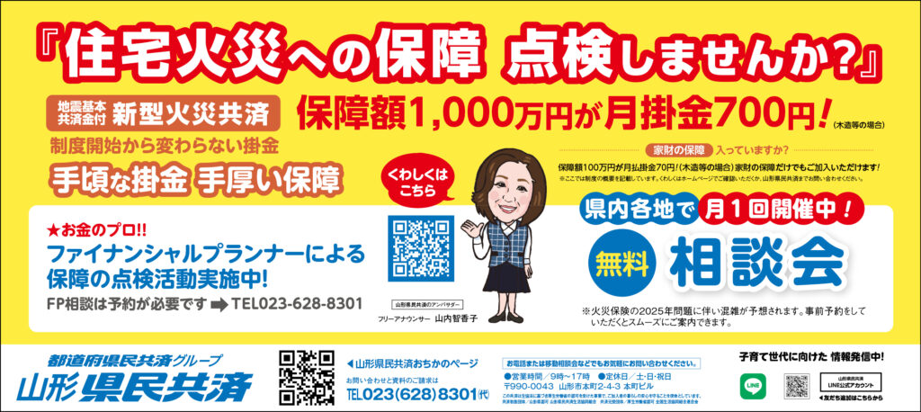 令和7年7月2日・9日・16日の山形新聞の紙面に『住宅火災への保障 点検しませんか?』の見出しで、県民共済の保障のご提案をしております。ぜひ紙面広告をご覧ください!くわしい内容は、山形新聞の広告にある二次元バーコードを読み込んで「おちかのページ」をチェックしてみてください。また、無料相談会のご案内、山形県民共済LINE公式アカウントへの二次元バーコードもありますので、ぜひご覧ください!