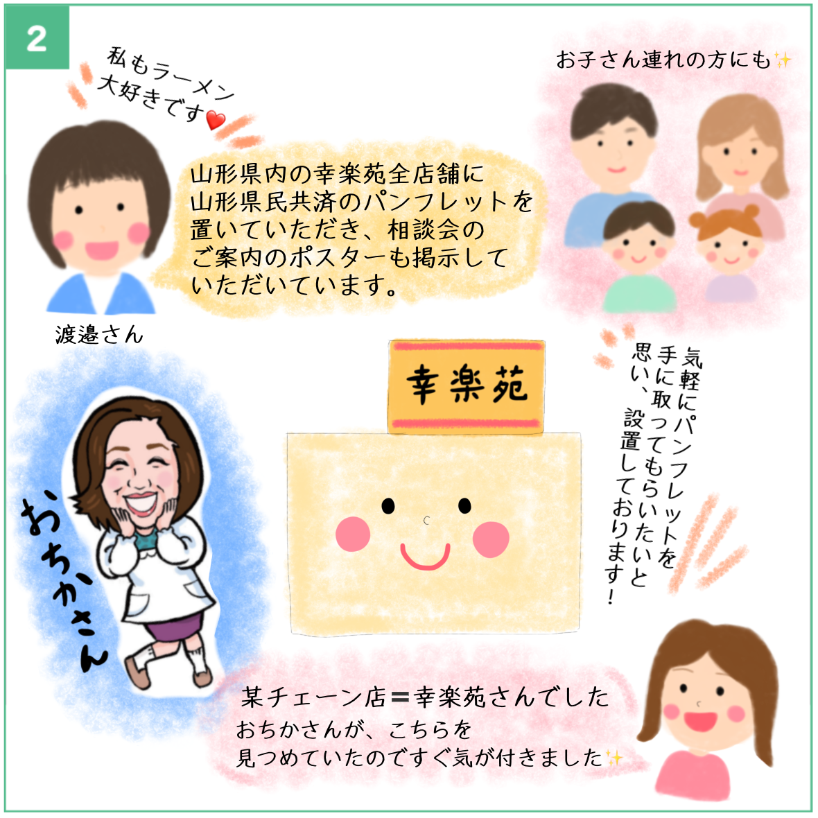 おちかさんが、こちらを見つめていたのですぐ気が付きました。県民の身近なラーメン屋さんでも山形県民共済のパンフレットを手に取ることができるんですね!