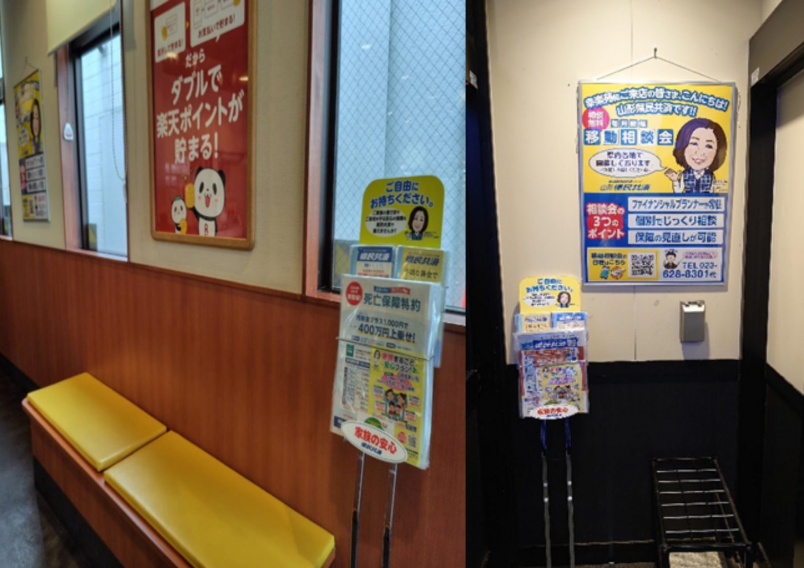 はい、幸楽苑はお子さん連れのご家族の方も多くご利用されるので、そういった方々に山形県民共済を知ってもらい、気軽にパンフレットを手に取ってもらいたいと思い設置しております。店舗内の待合スペースや風除室に設置していただいているところが多いので、順番を待っている間などにぜひご覧ください。幸楽苑の他にも山形県内の