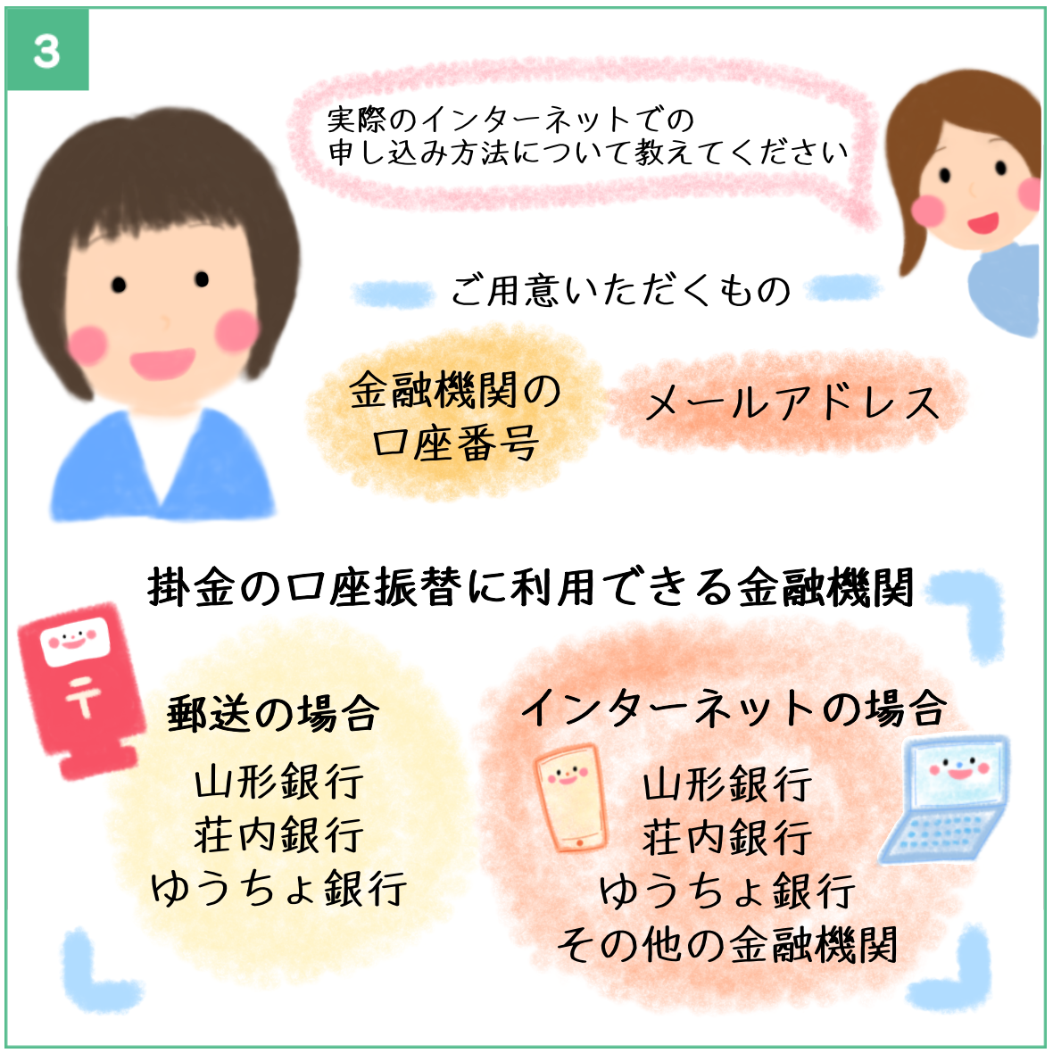 郵送でお申し込みの場合、掛金の口座振替にご利用いただける金融機関は、山形銀行・荘内銀行・ゆうちょ銀行の3行に限定されますが、