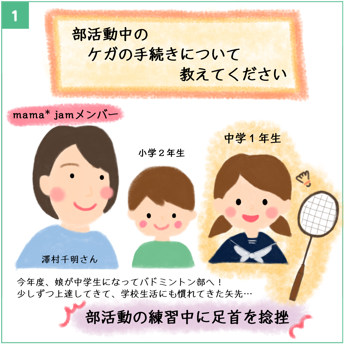 ②1月21日16時頃、学校の体育館でバトミントン練習中に足をくじいてしまいました。