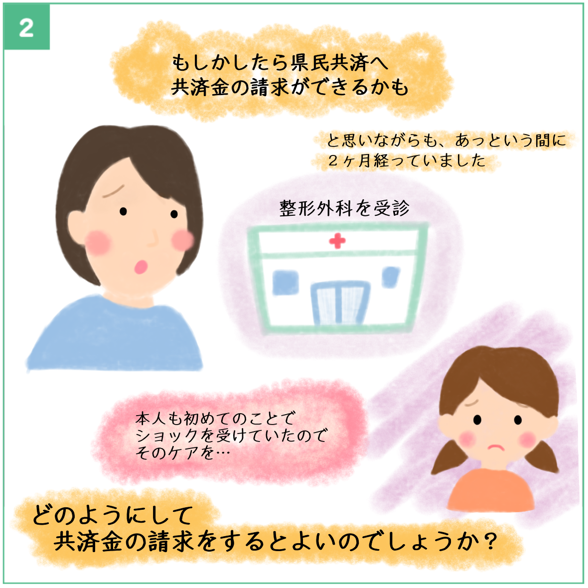 「もしかしたら県民共済へ共済金の請求ができるかも」と思いながらも、整形外科を受診したり、本人も初めてのことでショックをうけていたので、