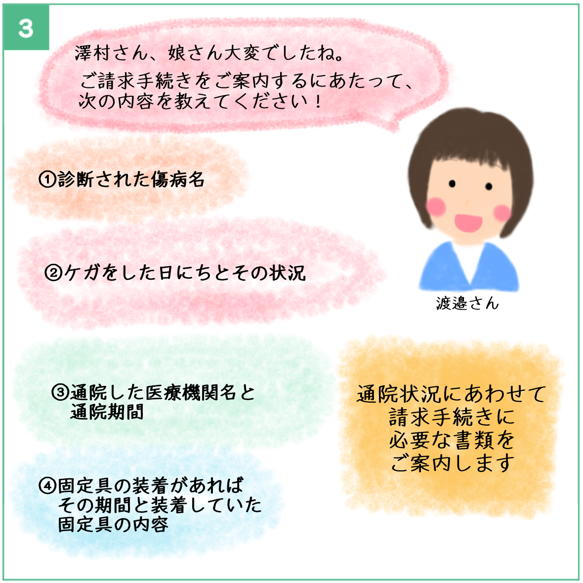 ですので、ご請求手続きは慌てずに様子を見ていただいて、通院が終了・完治した後に書類をそろえてご返送いただければ大丈夫ですよ。