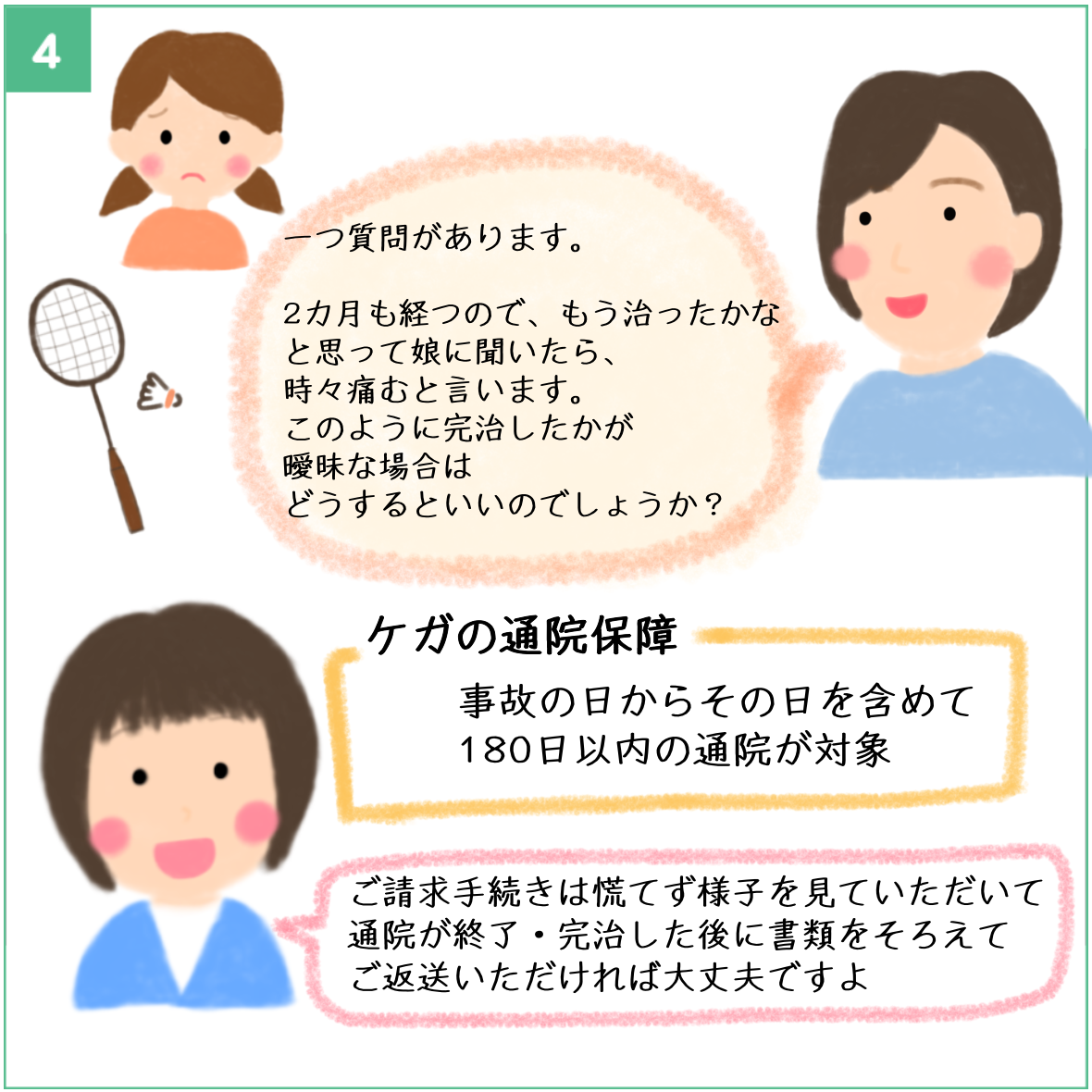 一つ質問があります。2ヶ月も経つので、もう治ったかなと思って娘に聞いたら、時々痛むと言います。請求手続き後に、同じケガでまた通院した場合はどのような手続きになりますか?