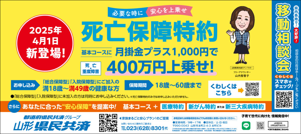 令和7年4月12日・15日・23日の山形新聞の紙面に『死亡保障特約のご案内』と銘打ち、新登場した死亡保障特約のご紹介をします。ぜひご覧ください!